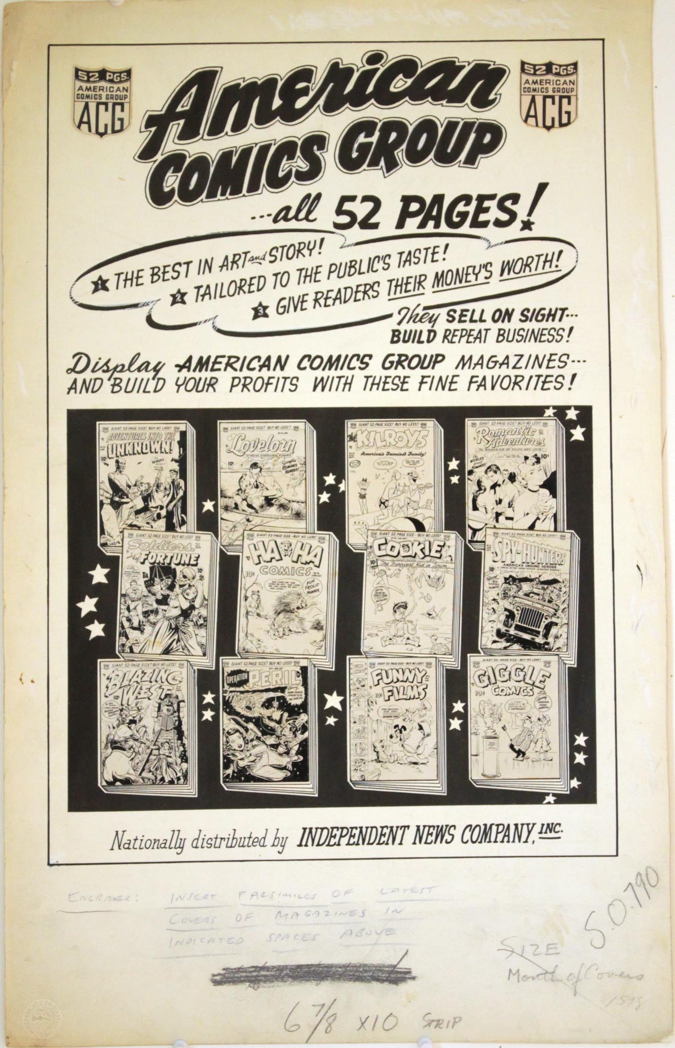 Specialty page, Ad for American Comics Group, comic artwork are stats. Great item.14 1’2” X 23”