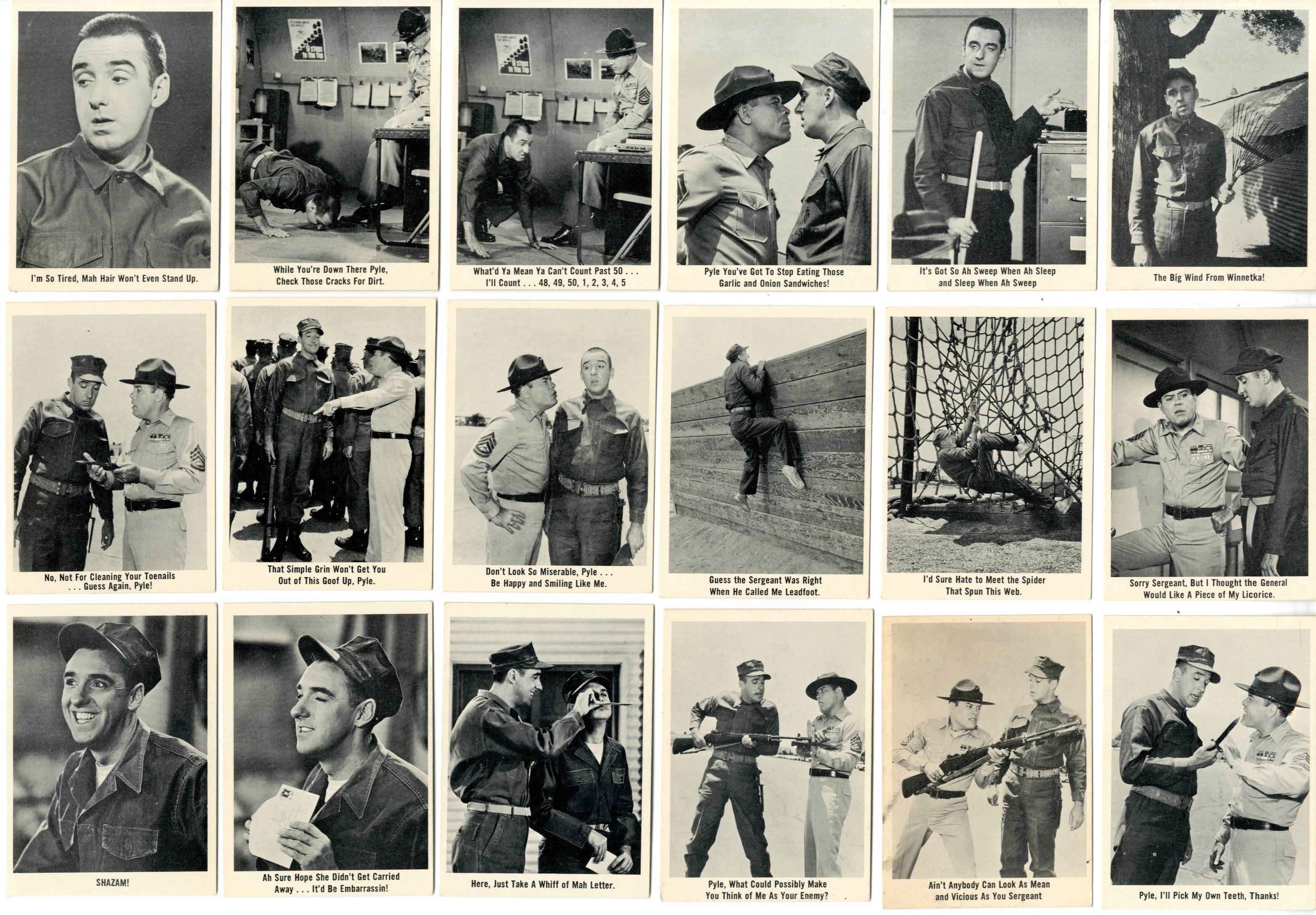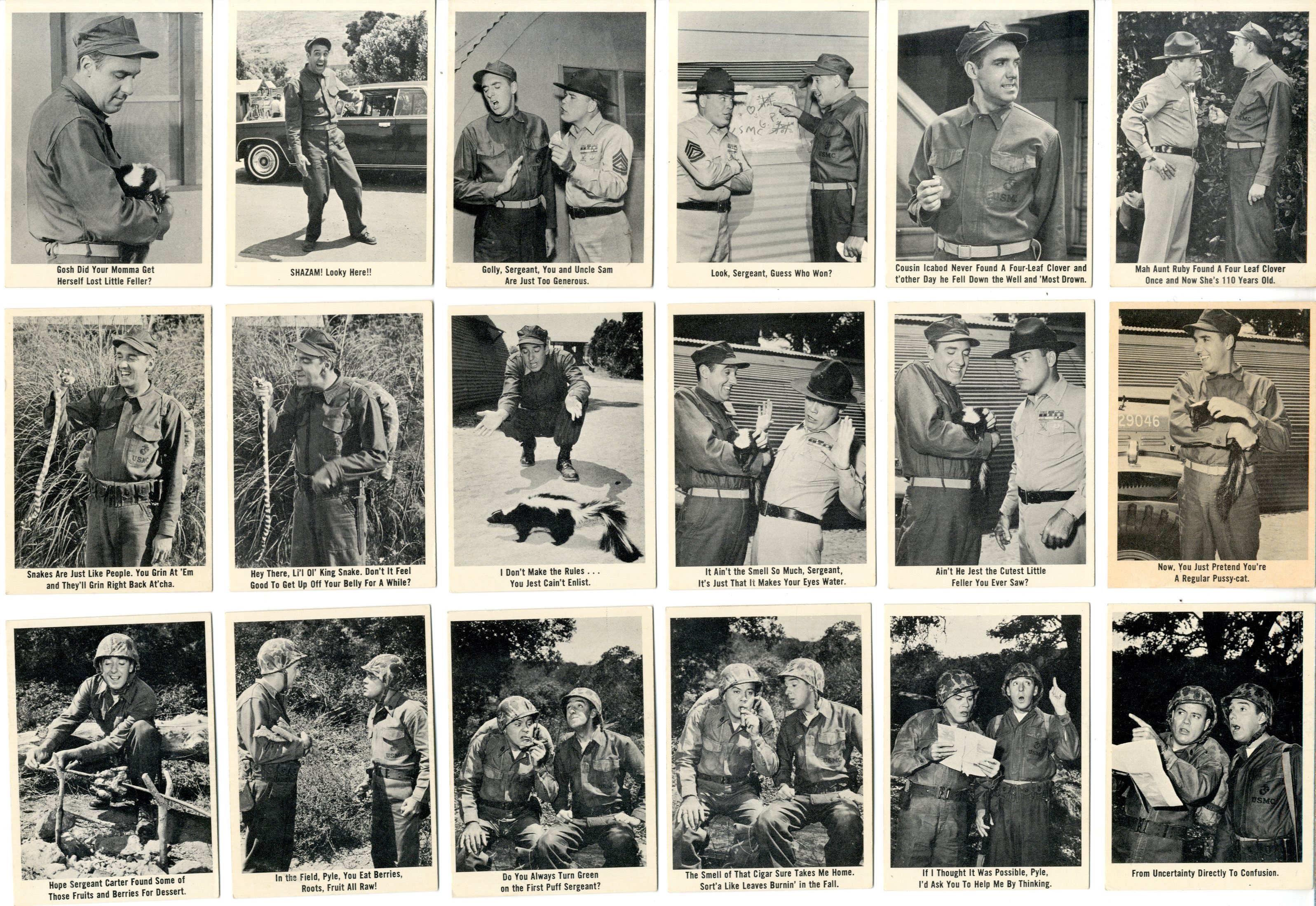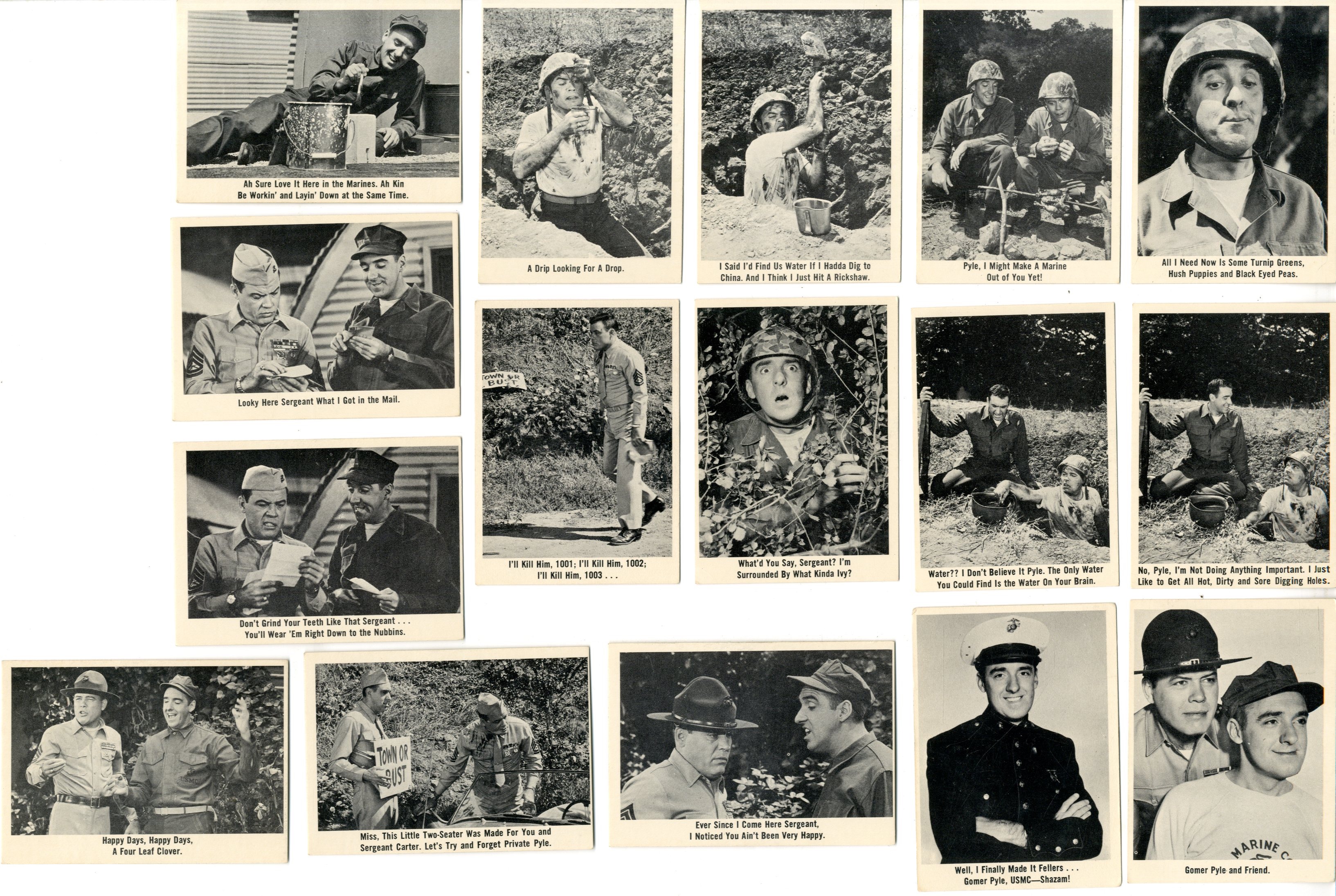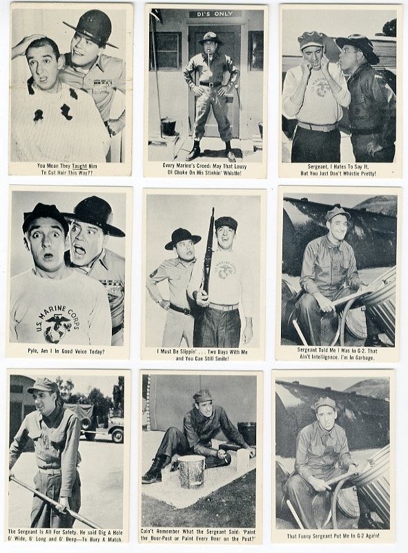 61 trading cards. Missing #’s 1, 7, 10, 64. Printed 1965. TV show ran from 1964-1969. Jim Nabor’s Gomer Pyle
