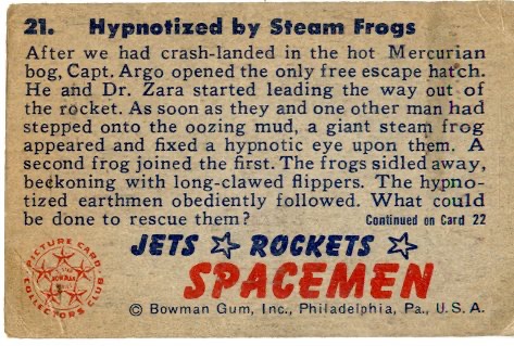 Hypnotized by Steam Frogs. The 1951 Bowman Jets, Rockets, and Spacemen Set (R701-13) contains 108 beautifully colored cards and depicts futuristic scenes of space adventure and exploration. The cards measure 2 1/16" x 3 1/8" and were printed in three groups of 36, with the middle series being the most difficult to obtain.