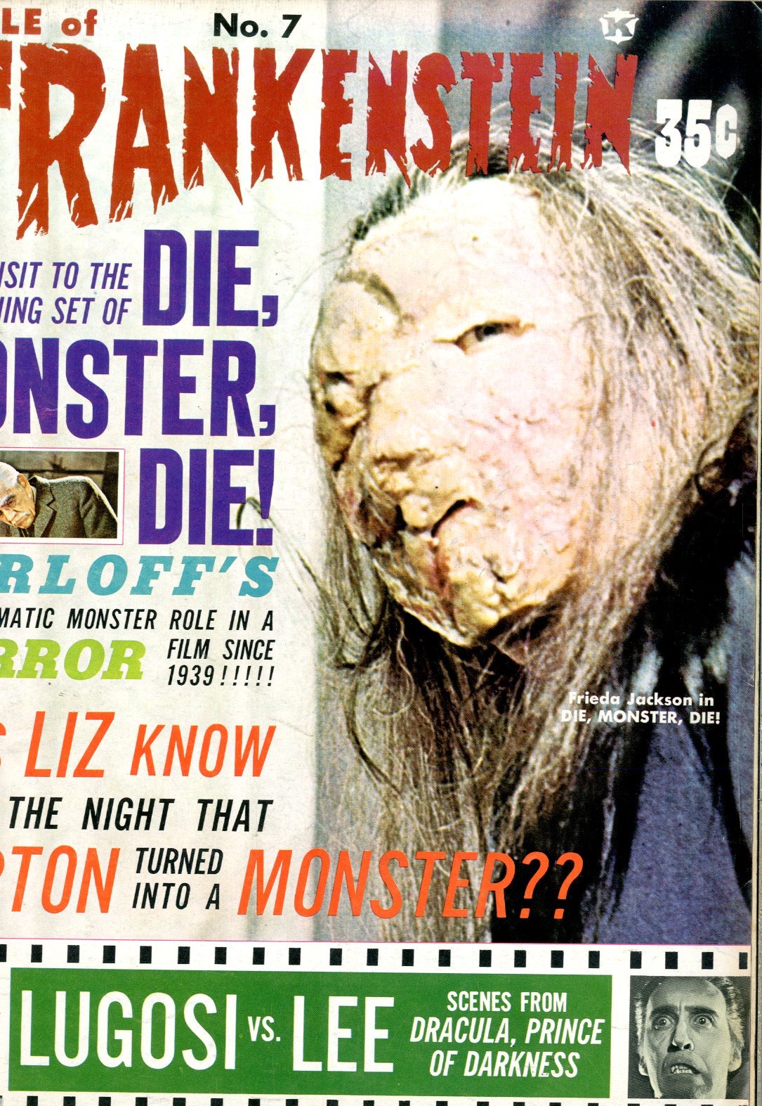 1964 Cover depicts Frieda Jackson in Die, Monster, Die This issue has articles on "Max" the monster (from Hercules and the Princess of Troy), the European film scene, Tomb of Ligeia, She, and The Avengers (television series). Also includes: "A Visit to the Set of Die, Monster, Die"; "Monsters from the Museum of Modern Art"; part four of "The Lon Chaney Jr. Story"; and "The Lon Chaney Jr. Filmography." Cover depicts Frieda Jackson in Die, Monster, Die. See photos
