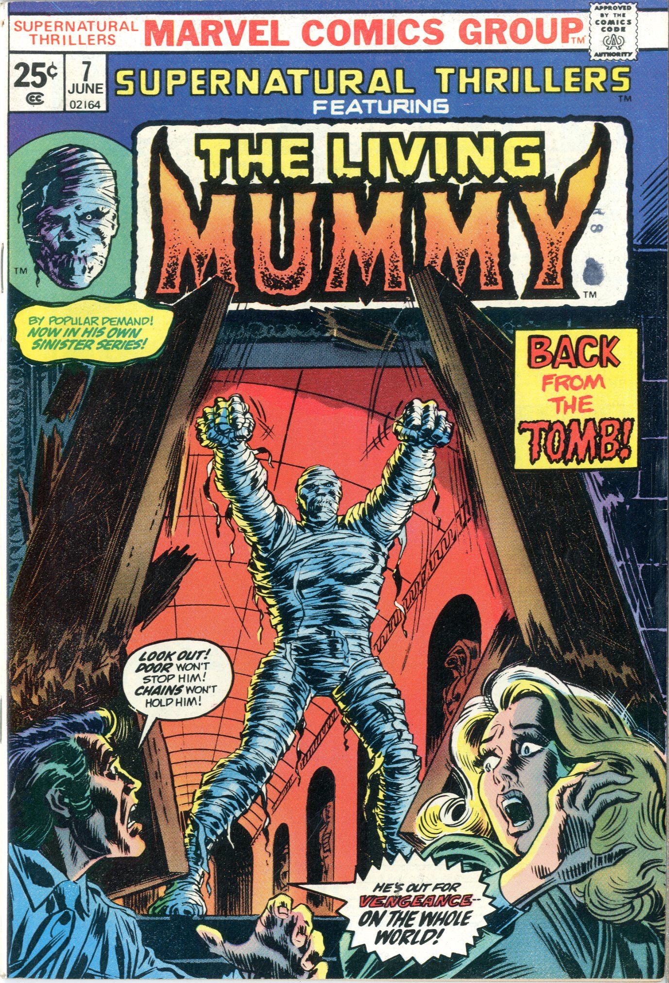 December 1973 The Living Mummy begins John Romita cover. Steve Gerber, Larry Lieber, STAN LEE story. Val Mayerik, George Tuska, Joe Sinnott art See photos