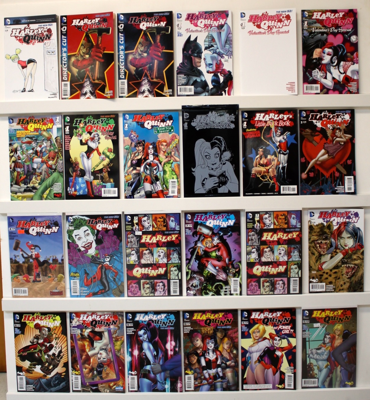 Lot of 33 comics: Issue #’s: 1 of # 0 plus 2 of # 0 but with different cover-Director’s Cut, 3 of # 1 each with a different cover (valentine’s day special), 5 of #1 (Invades Comic-Con Interntl, Holiday special, Road trip special, Harley’s little black book- book is sealed, Little black book featuring Wonder Woman), #3, #4, #6 Variant cover (batman ‘66), 2 of #7 with diff covers, 2 of #8 &9 all with diff covers, 10, 2 of #11 with diff covers, #12, 3 of #13 all diff covers 1 says variant, 2 of #14 with diff covers, #19, 30 plus Annual #1 (8 variant covers in total). VFNM, may have a few lower grade, if that. See photos