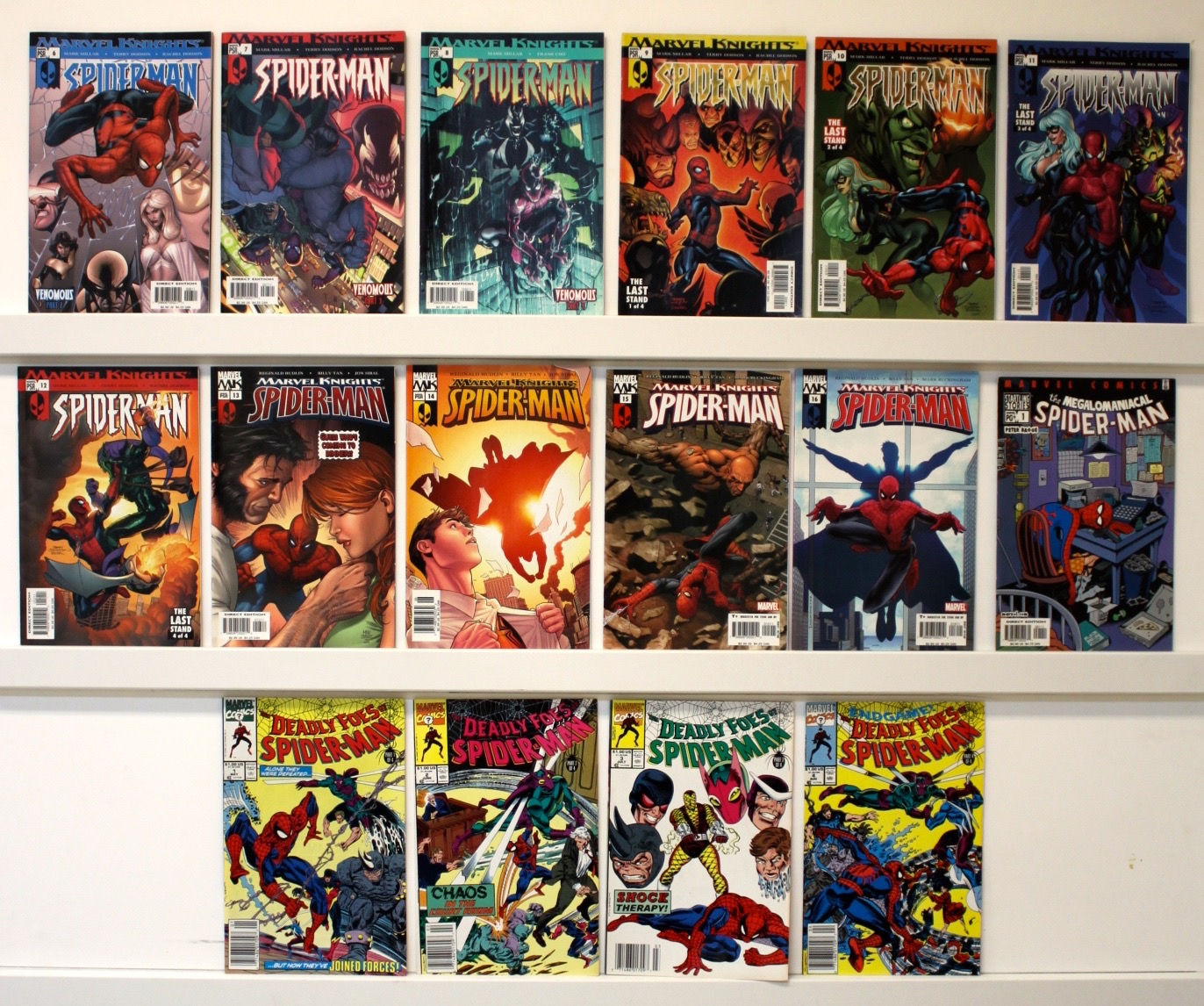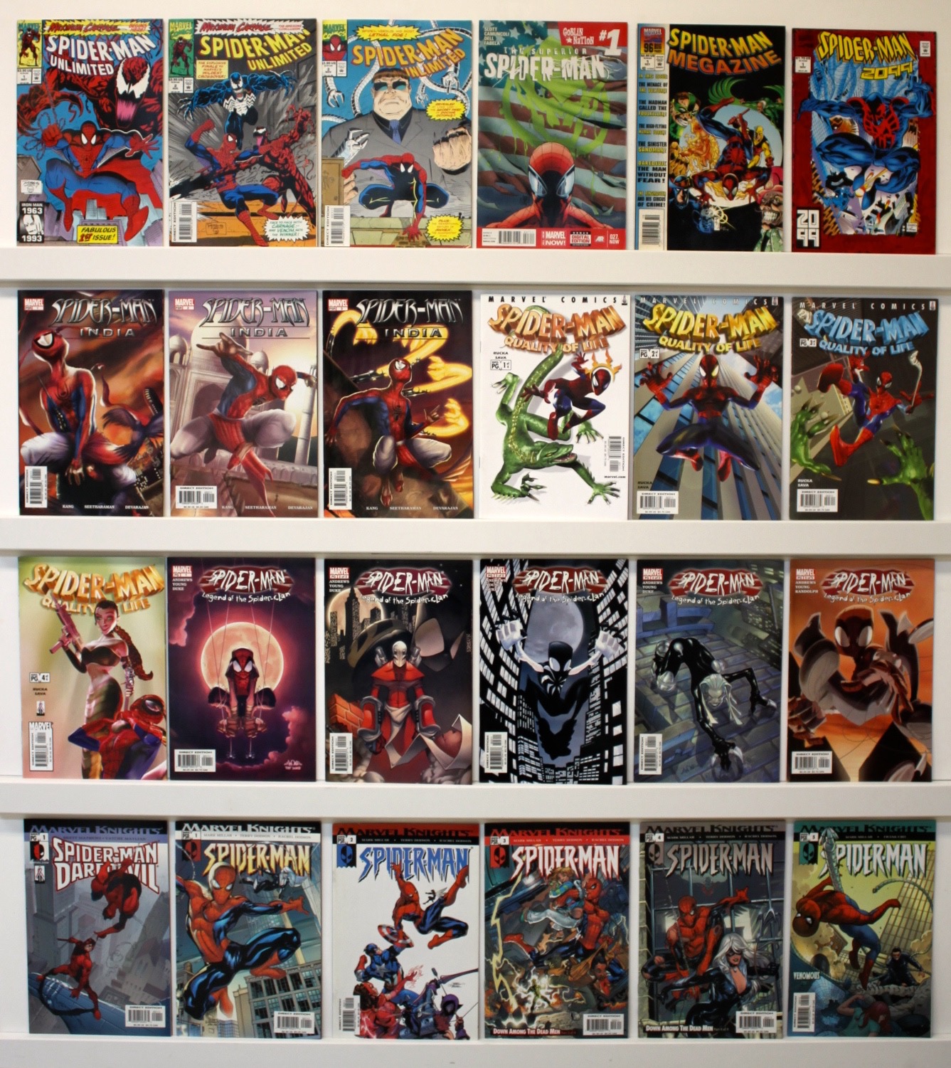 Lot of 40 comics. VF+, many are much nicer. Issue’s: Spider-Man Unlimited:1-3, Superior Spider-Man 1, Spider-Man Magazine 1, Spider-Man 2099, Spider-Man India 1-3, Spider-Man Quality of Life 1-4 ALL, Spider-Man Legend of the Spider Clan 1-5 ALL, Spider-Man Daredevil 1, Marvel Knights Spider-Man 1-16 straight run, Megalomaniacal Spider-Man 1, Deadly Foes of Spider-Man 1-4