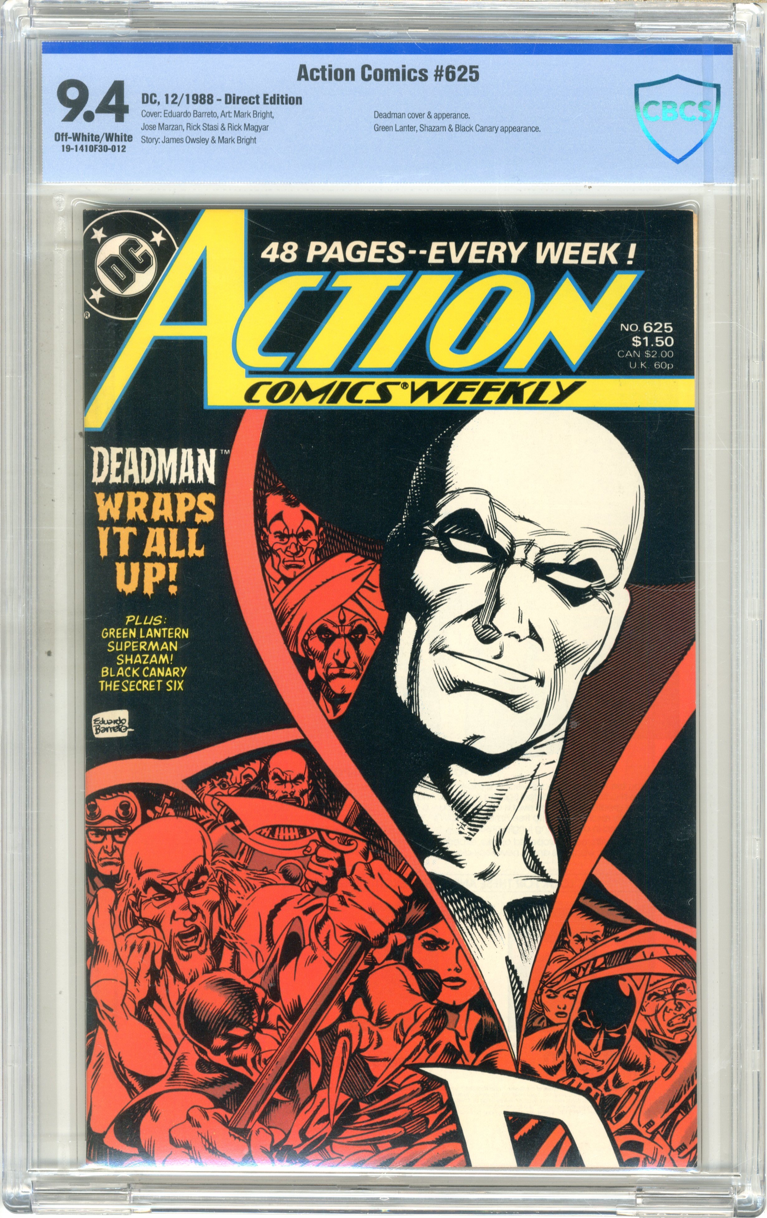 cbcs 9.4 Off white- white pages 12/88 Deadman cover & App. Green Lantern, Shazam & Black Canary App. Direct Edition See photos If it looks like there might be scratches on the case, there aren't, it is just from our scanner. The case is perfectly fine.