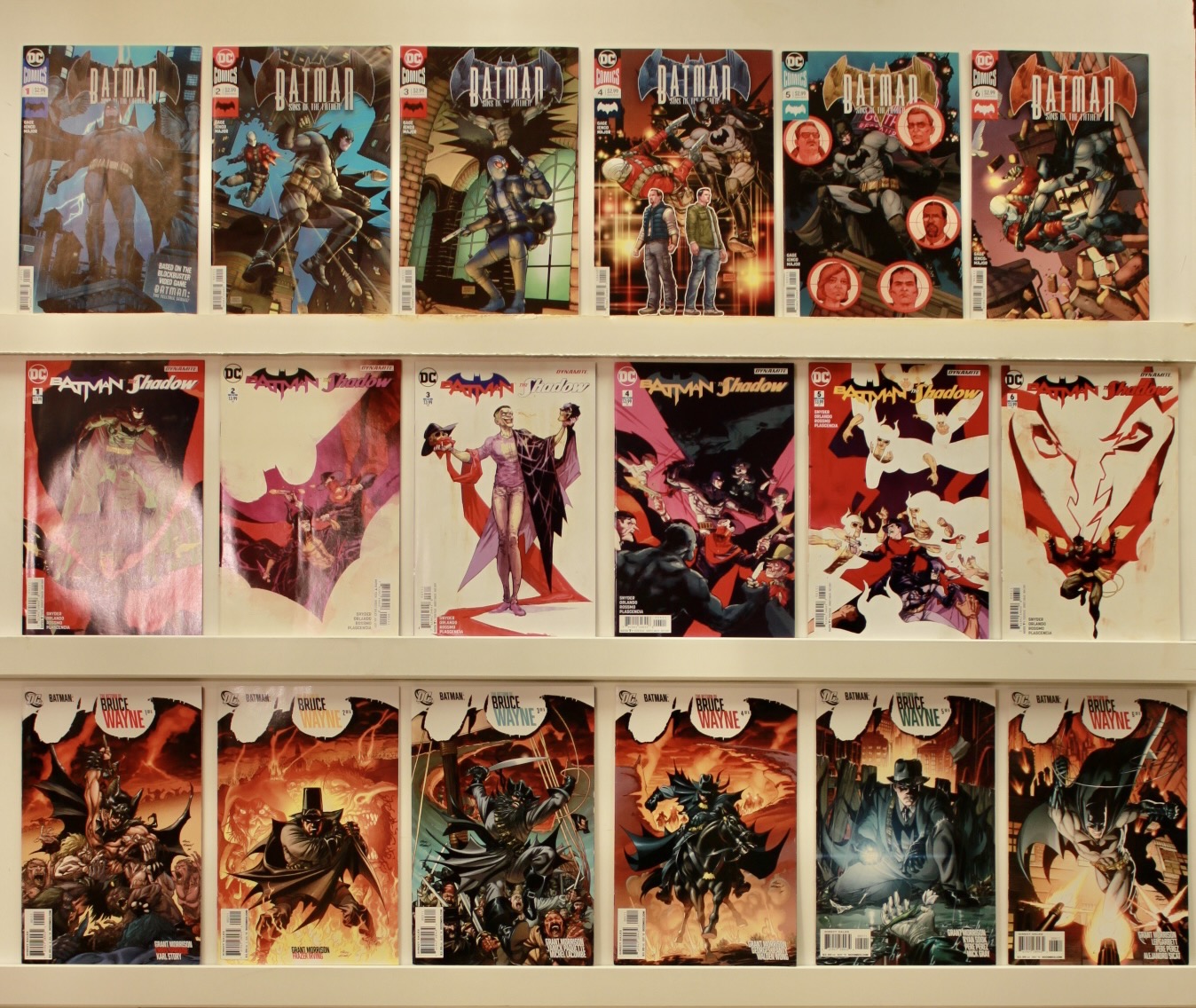 Lot of 18 books. Average grade is NEAR MINT-. There may be several issues that are of a lower grade. Issues: Issues: Batman Sins of the Father #’s 1-6, Batman The Shadow #’s 1-6. Batman Return of Bruce Wayne #’s 1-6 See photo. (There is nothing wrong with book #7 in picture- just glare from light when taking picture)