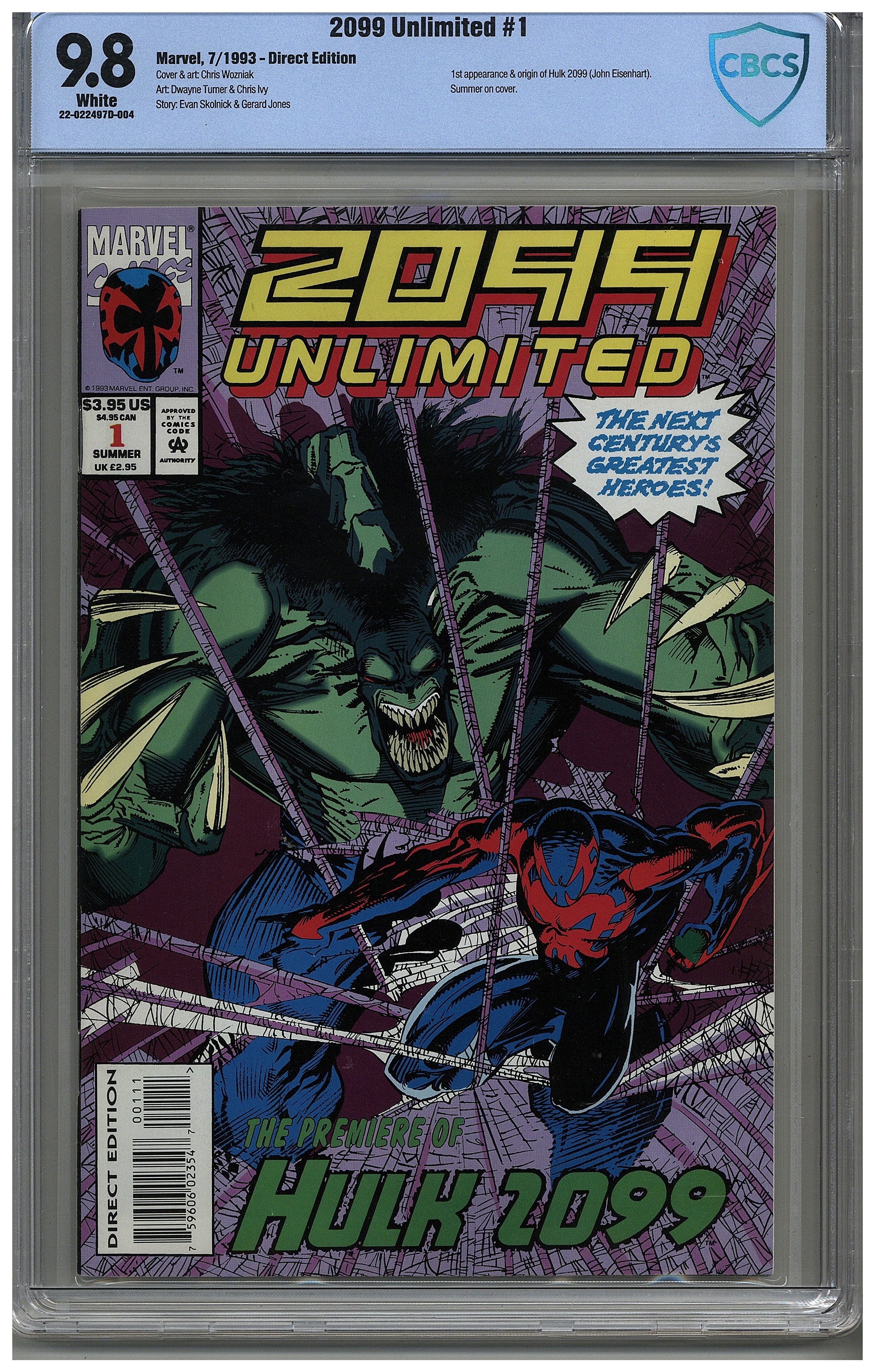 cbcs 9.8 White pages 7/93 1st App. & origin of Hulk 2099 (John Eisenhart). Summer on cover. Direct Edition See photos If it looks like there might be scratches on the case, there aren't, it is just from our scanner. The case is perfectly fine.