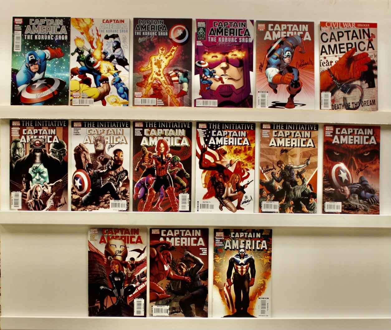 Lot of 15 comics. Very Fine, some may be of a lower grade, some better. 2011 - The Korvac Saga #’s: 1-4 of 4. each SIGNED by one creator. 2007 - Captain America #’s: 25, 25 Variant SIGNED by two creators, 26-33 each SIGNED by 2 creators, 50 See photos.