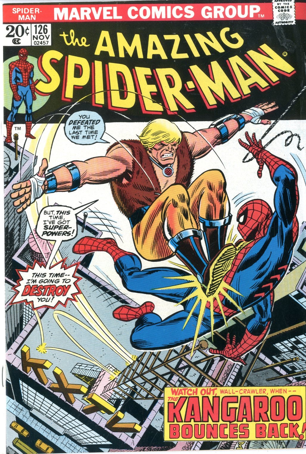 November 1973 Small stain below cc code, small crease upper right. 1st Kangeroo App. Human Torch App. John Romita cover Gerry Conway story Ross Andru, Jim Mooney art. See photos