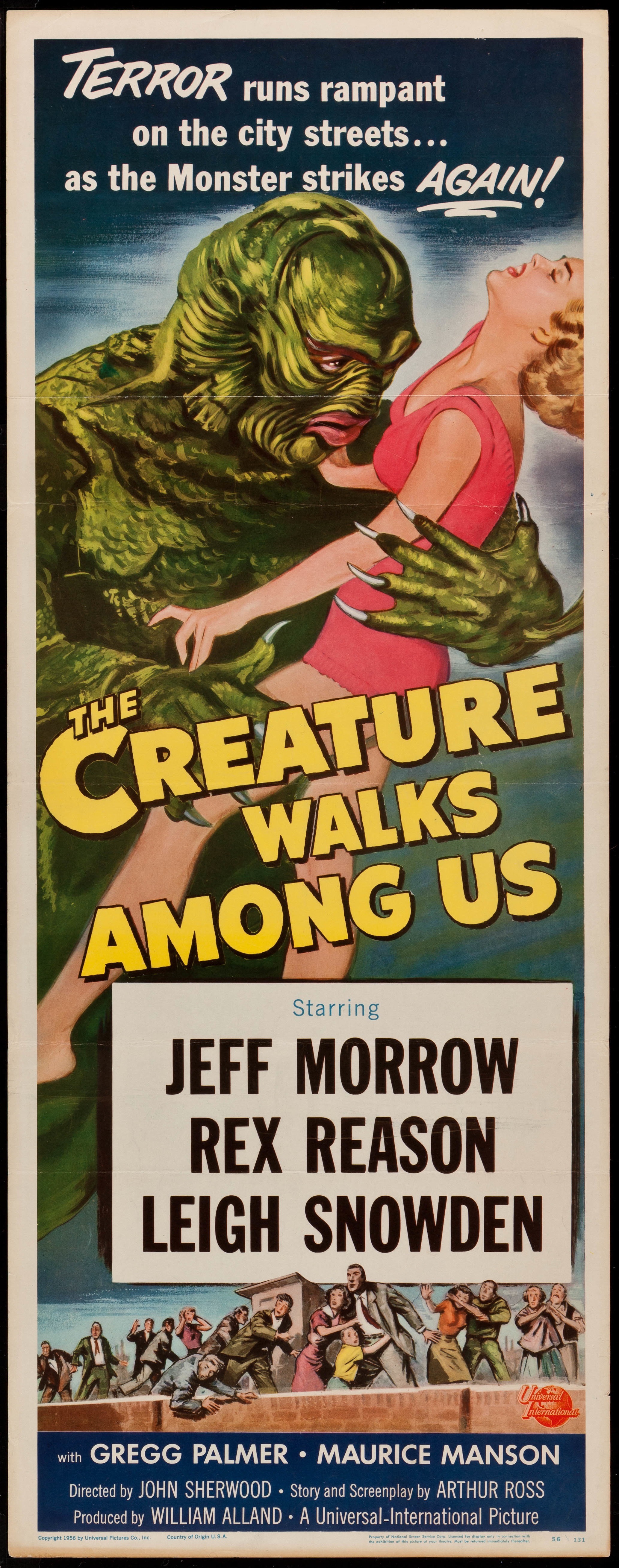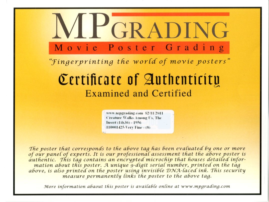 Insert, folded, unrestored graded (8) by MP Grading VERY FINE- 14 x 36 There is a dust shadow at the very bottom of the poster, across the bottom, there is an extra fold under the text "Rex Reason" in the white portion, and an extra fold across the Creatures head, just above his lips. There are some very small imperfections, little folds, in the border areas. Overall it is a beautiful poster in Very Fine condition, with no restoration.