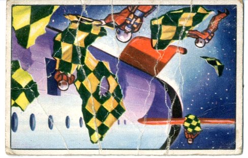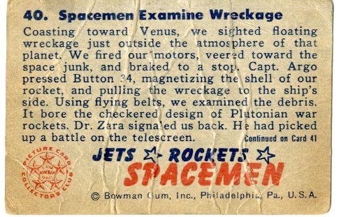 Spacemen Examine Wreckage. The 1951 Bowman Jets, Rockets, and Spacemen Set (R701-13) contains 108 beautifully colored cards and depicts futuristic scenes of space adventure and exploration. The cards measure 2 1/16" x 3 1/8" and were printed in three groups of 36, with the middle series being the most difficult to obtain.