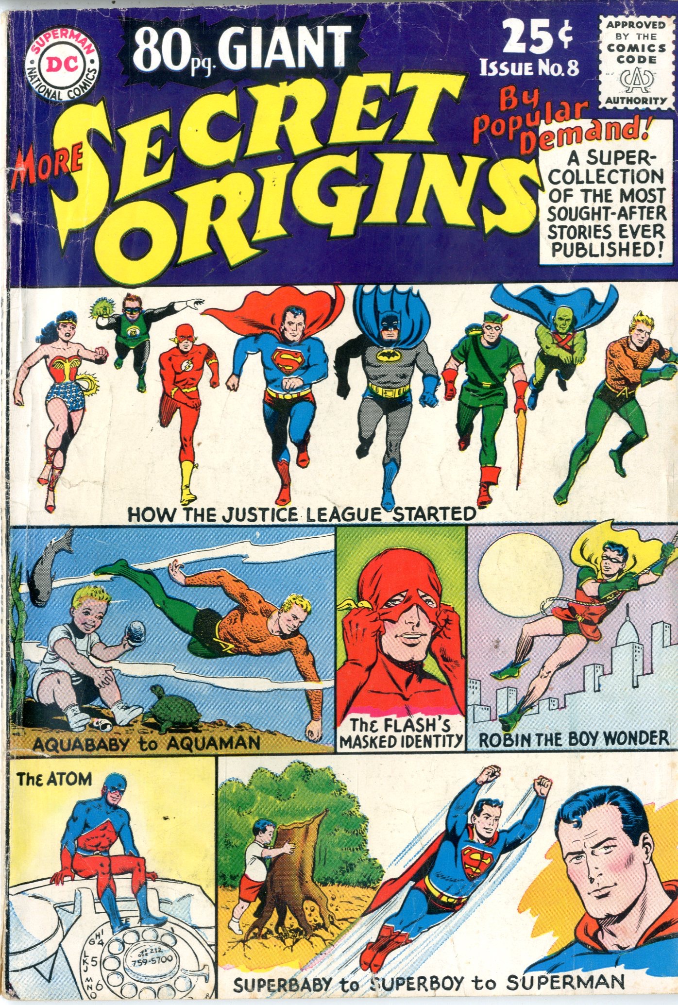 March 1965 More Secret Origins Origins of JLA, Aquaman, Robin, Atom, & Superman Murphy Anderson cover & art Gardner Fox, Jack Schiff, Robert Bernstein, Bill Finger, John Broome, Otto Binder story Mike SekowskyBernard Sachs, Sheldon Moldoff, Gil Kane, Ramona Fradon, Sheldon Moldoff, Charles Paris, Carmne Infantino, Joe Giella art See photos