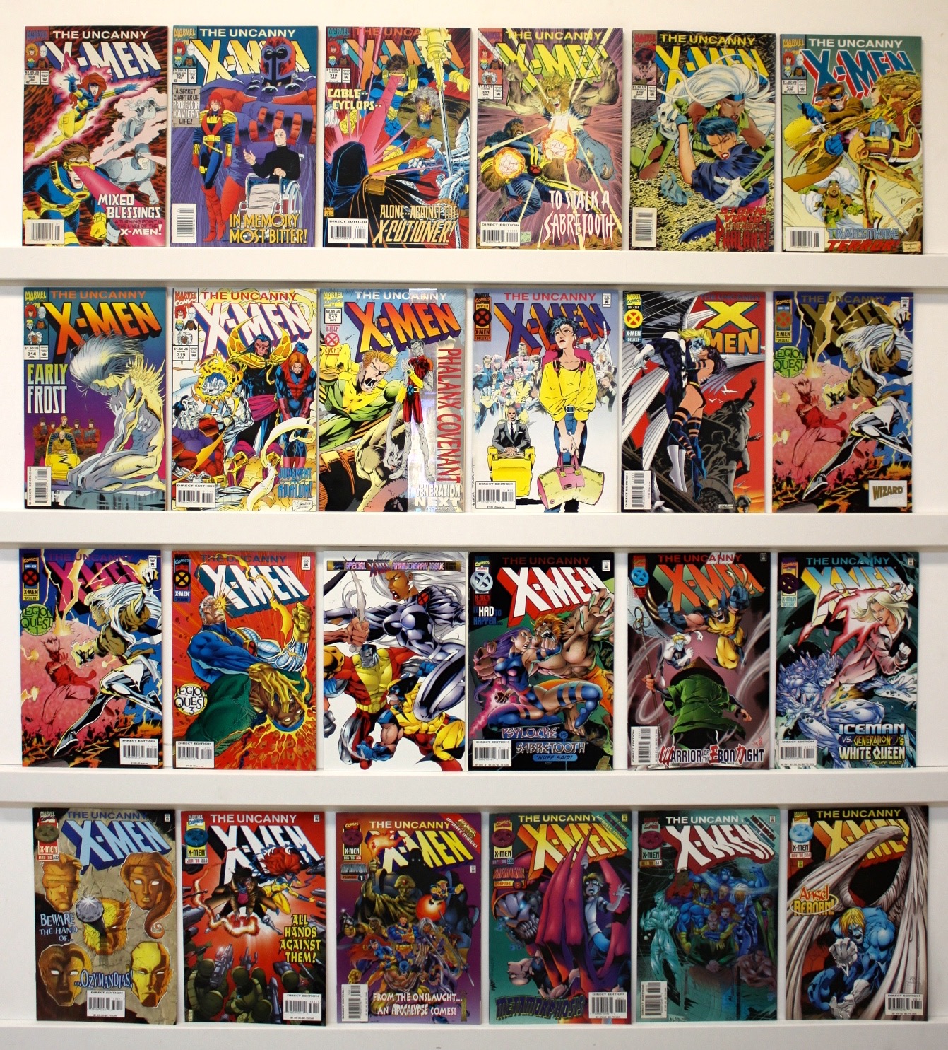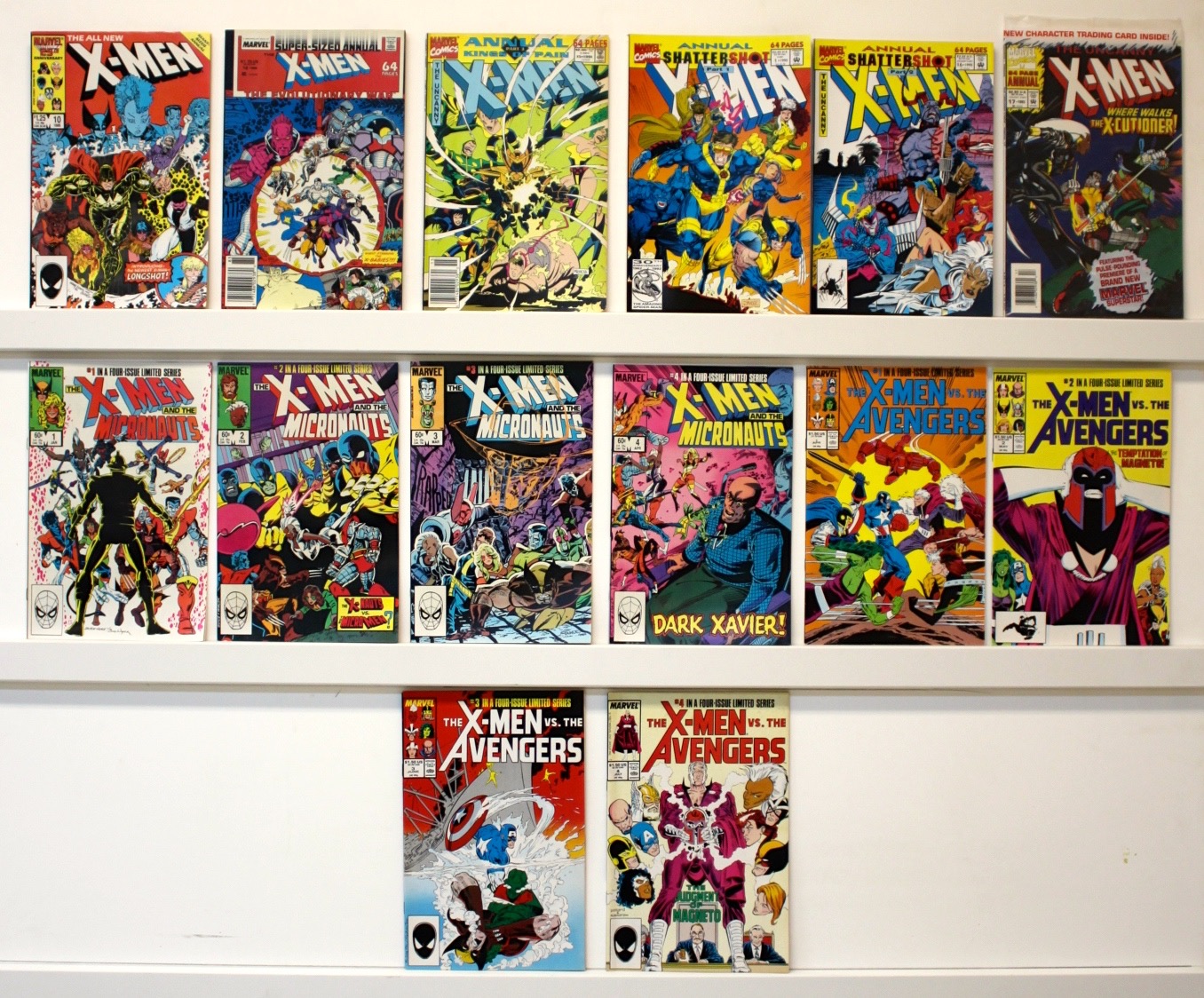 Lot of 62 comics. With the exception of several books, all are are NEAR MINT. Issue #’s: 281-287, 291-293, 299, 301, 304-310, 320, 325, Annuals 10, 12, 15, Shattershot Annual #1,2, 17, X-Men & Micronauts: #1-4, X-Men Vs. Avengers #1-4. See photos