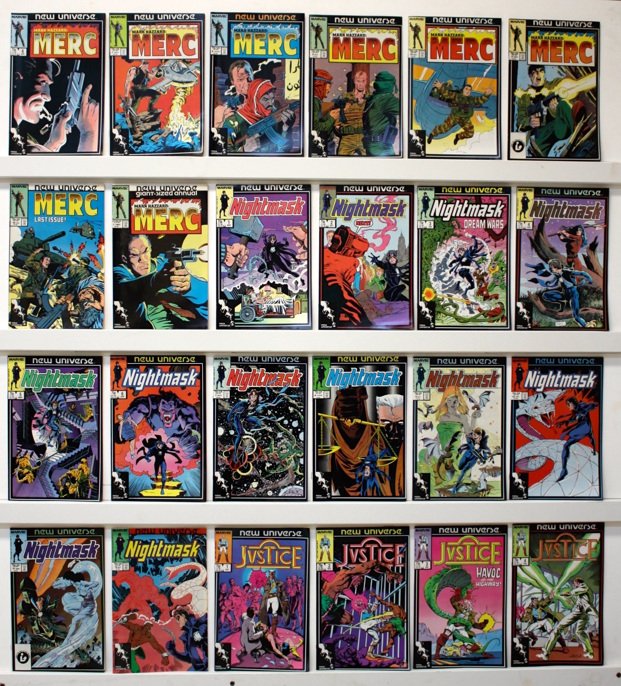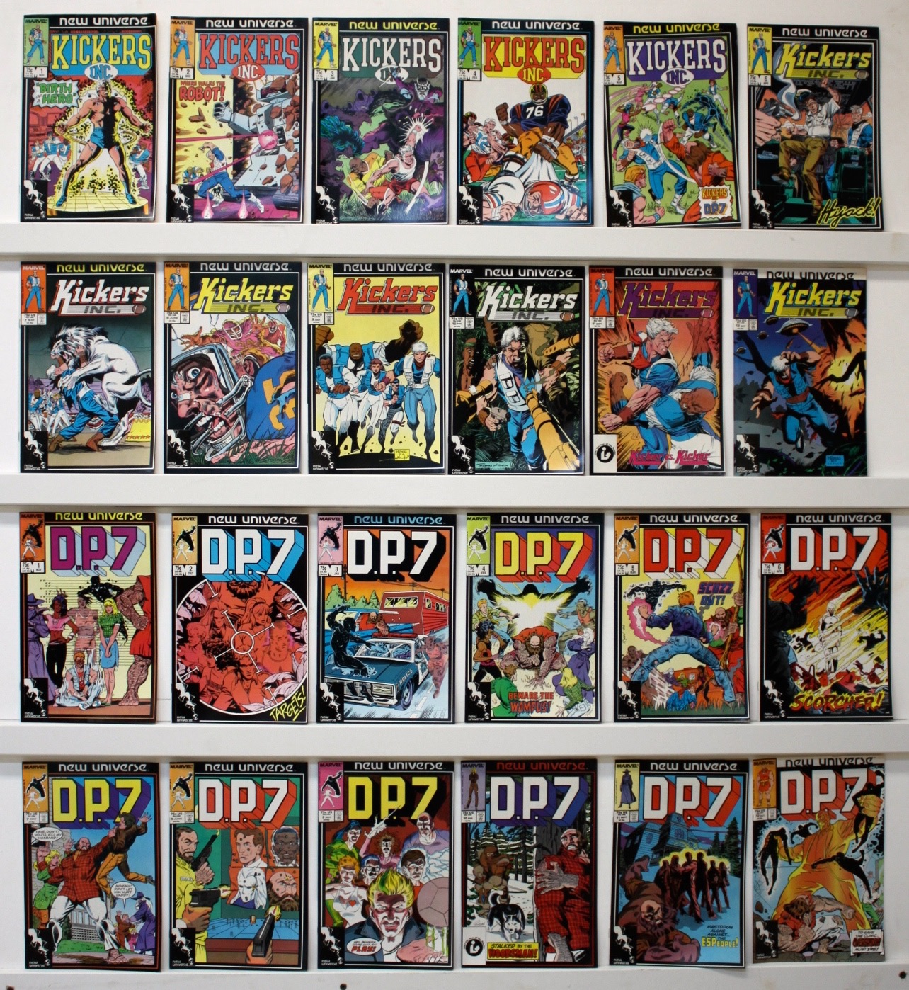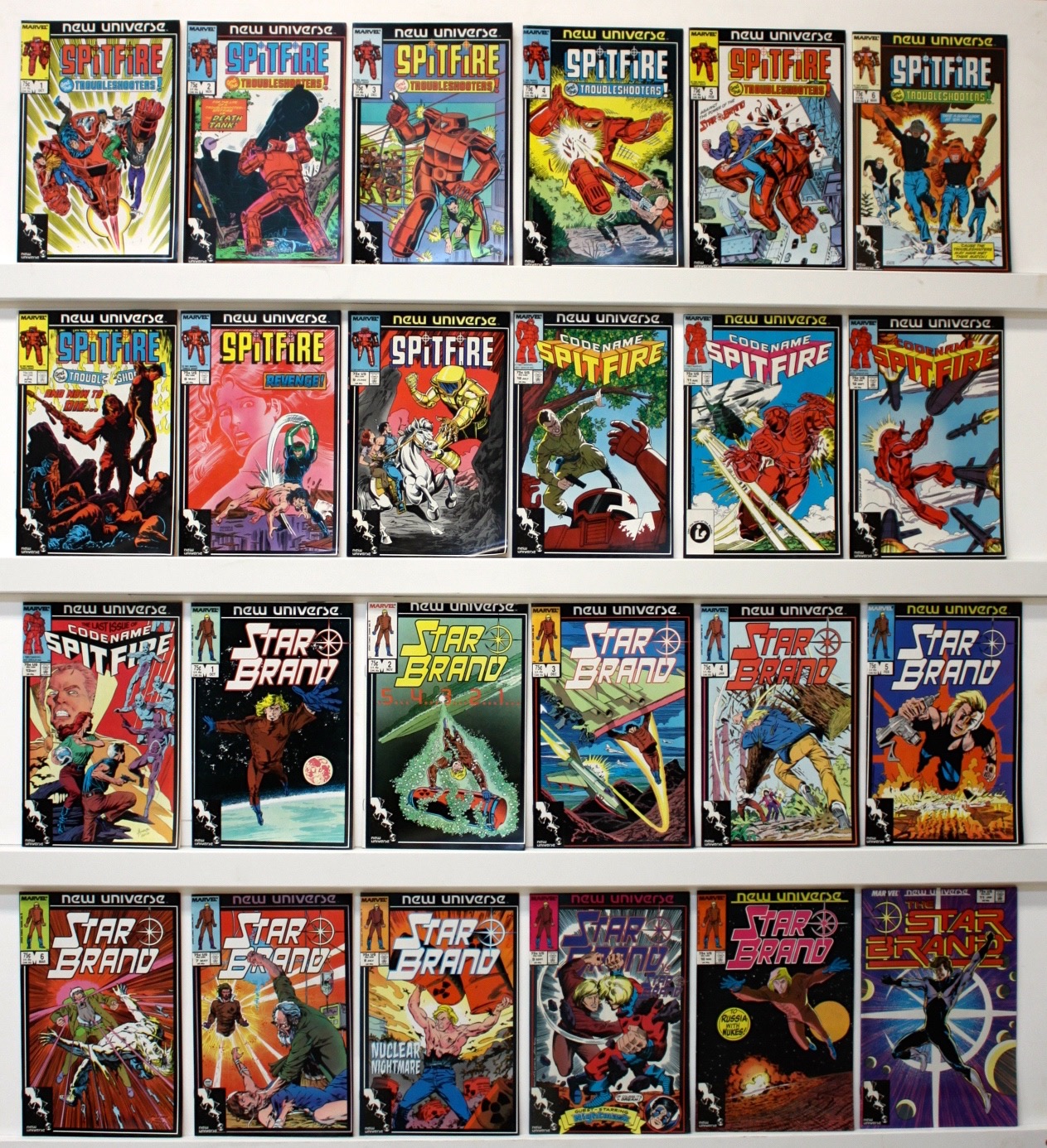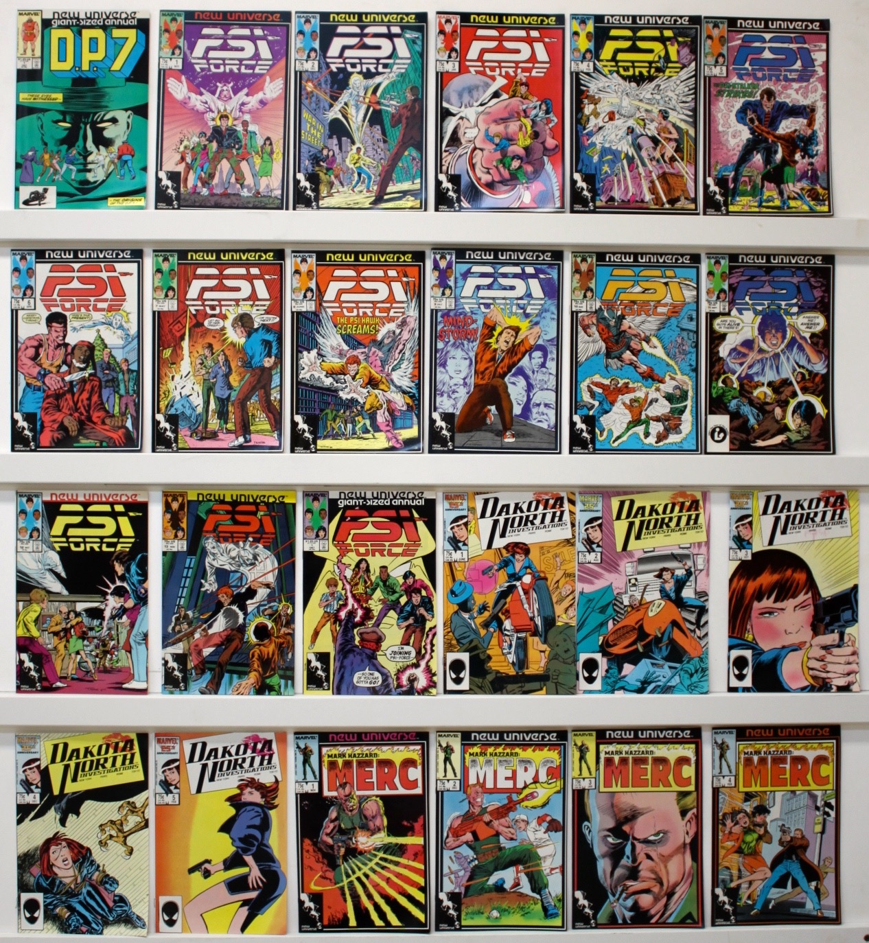 Lot of 105 comics. The books are VF or better There may be a few of lower grade but many more are better. Issue #’s: Spitfire 1-13, Star Brand 1-11, Kickers 1-12, D.P.7. 1-12 & Giant Sized Annual #1, PSI Force 1-13, & Giant Sized Annual #1, Dakota North Investigators 1-5, Mark Hazzard:MERC 1-4, 6-12 & Giant Sized Annual #1, Night Mask 1-12, Jvstice 1-13. See photos