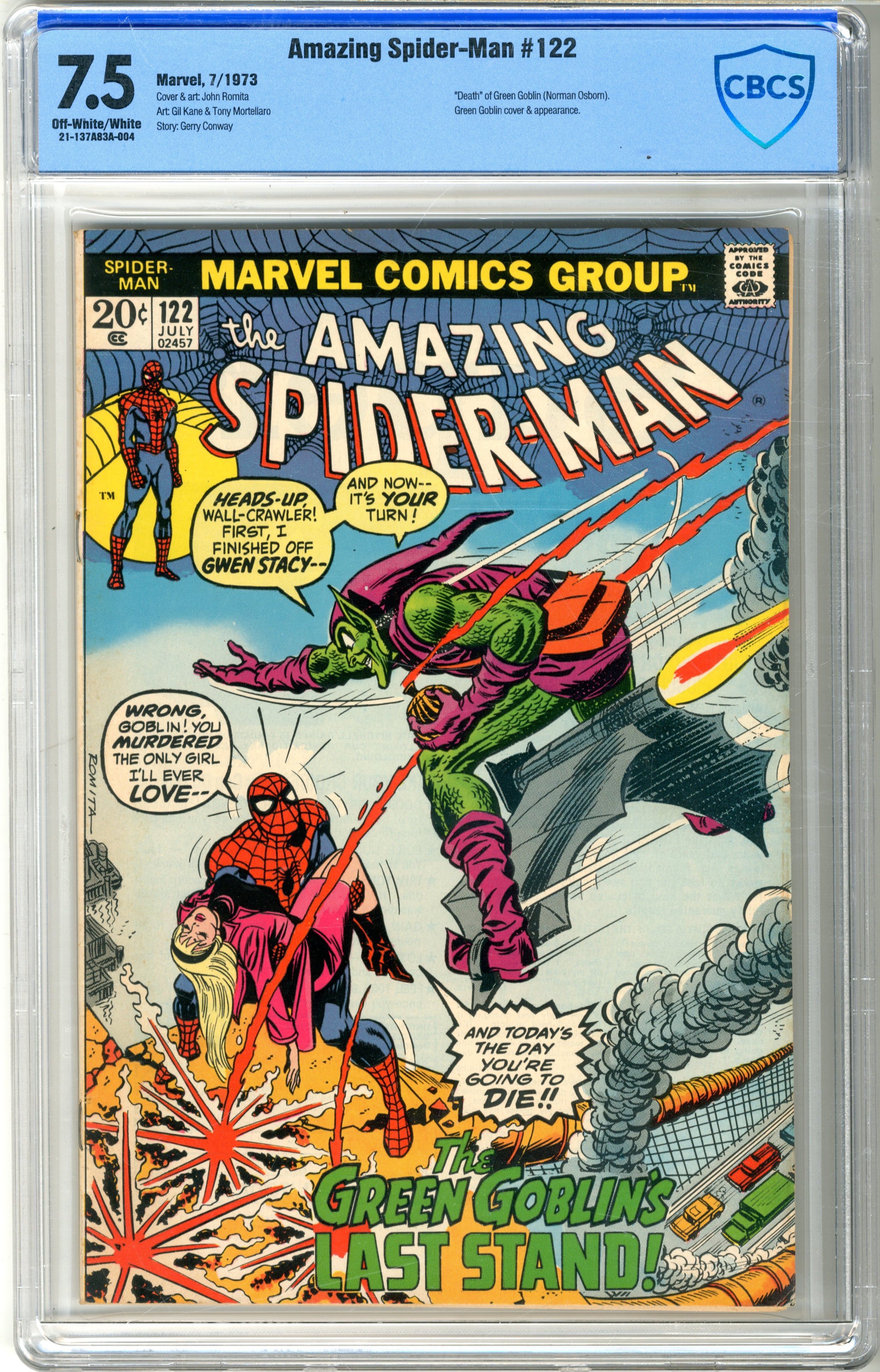 cbcs 7.5 Off-white to white pages 7/73. “Death” of Green Goblin (Norman Osborn). Green Goblin cover & App. See photos If it looks like there might be scratches on the case, there aren’t- it is just from our scanner. The case is perfectly fine.