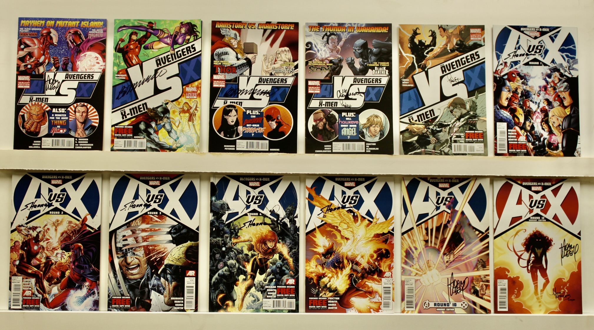 Lot of 12 books Each issue is SIGNED by at least one creator AVX:VS: 2012 #’s: 1 variant, 2 of #4- both different variant & covers, 2 of #5- both different variant & covers Avengers vs X-Man: 2012 #’s: 1-5, 10, 12 Average grade FINE VERY FINE with some of lower grade and some better. See photo