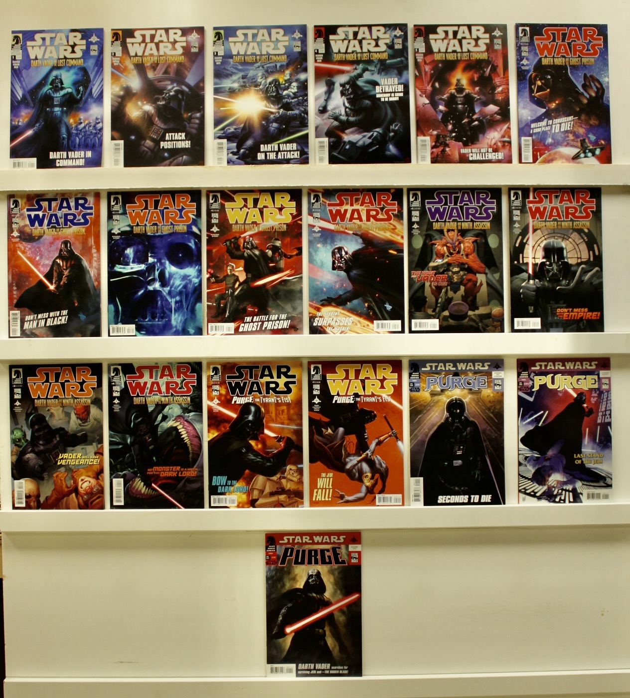 Lot of 19 books Darth Vader & the Lost Command 2011 #’s: 1-5, Vader Ghost Prison 2012 #’s: 1-5, Vader 9th Assassin 2013 #’s: 1-4, Purge the Tyrant’s Fist 2012 #’s: 1, 2 Purge 2009 3 different one shots Average grade is NEAR MINT with a few lower exceptions See photos